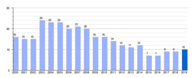 | Demography vertical bar chart of Verdeña between 2000 and 2019 |