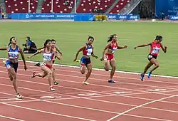 Veronica Shanti Pereira (born 20 September 1996)[3] is a Singaporean track and field athlete who specialises in the 100 m, 200 m, 4 x 100 m, and 4 x 400 m. She holds the 100 m national record (11.20s),[4] 200 m national record (22.57s),[5] 400 m national record (53.67s),[6] 4 x 100m national record (44.96),[7] 200 m SEA Games record (22.69s),[8] and the 200 m Asian Athletics Championships games record (22.70s).[9] She was ranked 1st in Asia in 2023 for both the 100 m and 200 m based on World Athletics' records.[10]