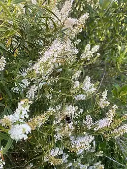 Veronica strictissima flowers in summer, sometimes till early autumn.[4][7] Individual plants will flower for 2–5 weeks.[9] The flowers on the spike of one plant will normally flower simultaneously.[9] Flowers are pollinated by a single species of bee native to New Zealand, Lasioglossum sordidum.[9] Seed capsules form during autumn[7] before dehiscing in late autumn.[9] Seeds are wind dispersed,[14][15] but can also be dispersed by birds and lizards.[13]