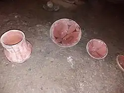 About 2,500 ceramic vessels and 200 cooking vessels from the early Schypynetska group have been recovered.[34] This group occupied the cave for about 195 years; a 2010 study dated a sample of ceramics to 3745–3550 BCE.[33] Their pots come in a variety of shapes and are characterized by their grooved, spiralling ornamentation and were painted with red, black, brown, and white pigments.[32] However, dozens of ceramics and fragments from this era were found to have been imported from the neighbouring Badrazhy group, as well as the more distant Bodrogkeresztúr and Lublin-Volhynia cultures.[35]