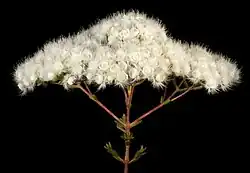 The flowers are usually scented and arranged in corymb-like groups near the ends of the branches, each flower on an erect stalk that is 2–4 mm (0.08–0.2 in) long. The floral cup is shaped like half a flattened sphere, about 1.0 mm (0.04 in) long, constricted in the middle, warty and hairy near the base. The sepals are pale pink to magenta, fading to white and sometimes the sepals are white. They are 2.0 mm (0.08 in) long, with 3 or 4 feathery lobes, and have one or two hairs up to 4.5 mm (0.2 in) long. The petals are the same colour as the sepals, 1.2–2.0 mm (0.05–0.08 in) long, and egg-shaped to almost circular. The style is straight, 5.5–6 mm (0.22–0.24 in) long, and hairy near the tip. Flowering time is from December to February.[1][2]