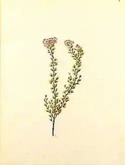 This species began to be cultivated shortly after this discovery, its profuse and attractive form during flowering gaining the attention of nurserymen in England. The species is cultivated as an ornamental shrub, is small in size, and usually presents rose-pink flowers that are profuse and perfumed. These appear during November, continuing until April in the garden, opening together, and nearly covering the leaves and branches. It is usually propagated from cuttings, and grows well in sandy, gravelly, or loamy soils, and the woolly heads of honey-scented flowers sometimes appear during the plant's first year of growth.[1] The dried flowers are often used for flower arrangements, and retain their colour for a considerable time.[9]
