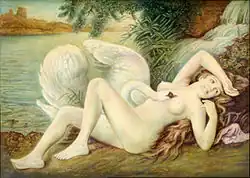 The duo M/M (Paris), known for applying and integrating their work on photographs (so called dessin dans l'image, or "drawings in the picture"),[73] illustrated the cover, featuring a swan and the album's title with feathers. Björk thought swans embodied Vespertine's music, describing them as "a white, sort of winter bird" and "very romantic".[74] Vespertine came with a booklet of M/M (Paris) artwork.[75] Michael Hubbard of musicOMH commented, "the spine of the CD is entirely white, while the rest of the sleeve features innovative photography and artwork".[49] Academic Nicola Dibben has likened Vespertine's artwork and promotion to representations of the Greek myth of Leda and the Swan, emphazising the erotic overtones of both.[43]