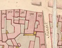 At the time of the 1787 census, No. 239 was home to three households. Hans Brehdahl, a tobacco spinner, resided in the building with his wife M.Marie Westh, their three-year-old daughter, two daughters from his first marriage (aged 15 and 18), and one maid.[2] Mogens Fransen, a beer seller (øltapper), resided in the building with his wife Berte Friderichs.[3] Niels Aagesen, another beer seller, resided in the building with his wife Mette Jørgensen.[4]
