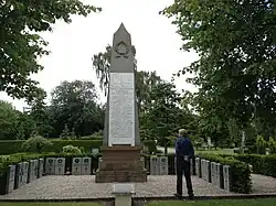 Just inside the main entrance is Arne Bang's bronze statue En Falden ("A Fallen"), which was installed in 1942 to commemorate the Danish soldiers that were killed when Denmark was occupied by Nazi Germany on 9 April 1940. In the North Chapel's courtyard garden are two reliefs by the artist Henrik Starcke, Death and Resurrection, which were installed in 1949. They were a gift from the Albertina Foundation.[4]