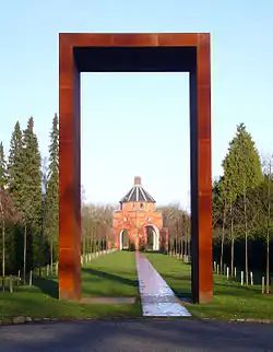 The complex consists of two intersecting axes with the former Southern Chapel in its centre. The chapel was partly demolished, leaving only the central part as an open pavilion-like domed structure. The building is partly overgrown by ivy. The surrounding garden spaces of the two axes, creating a Greek cross, are confined by tall yew hedges and have a grass surface. Embedded in the lawns of the cross arms are narrow, rust coloured paths made of oxidized iron plates, flanked by rows by cherry trees. At the end of each cross arm is a 9 metre tall rust coloured iron arch.