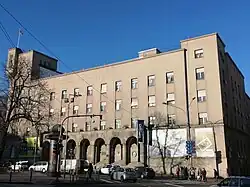 The prominent restrained concept of the front of the building, with no ornaments is applied, especially in the first to third floor zone perforated with sets of vertically aligned windows. The distinctive accent in the ground-floor zone is the central loggia with its slightly protruding arcade supported by massive columns and fronted by a wide flight of stairs. A particularly prominent feature of the building is the corner tower which somewhat relieves the monotony of the front façade, while emphasising the building's expressive monumentality and military character. The idea behind the tower, inspired by medieval and Renaissance models in form, was to emphasise the physical presence of the building and, on the symbolical level, to function as a visual statement of its military character. The symbolism of such an architectural program is best summed up in the words of Мilutin Borisavljević in the magazine Pravda, from 24 May 1929: Veterans Club needed to be framed in soldierly terms, in the form of a fortress, a medieval castle with turrets and donjons, with perhaps somewhat brutal forms, a character of masculinity, heroism and more. Architecture is a symbolic art: the exterior of a building should be expressive of its use.” This symbolism was also to be expressed by a proposed but unrealised sculptural program consisting of eight statues, one above each column of the loggia: a medieval armoured warrior of the Nemanjić age and of the age of Stefan Dušan, a Kosovo warrior, a gusle player (a traditional Serbian instrument), a member of Karadjordje's insurgent army, a soldier of the 1876 War of Independence, a First Balkan War soldier of 1912, and a Yugoslav soldier of 1918. The founders intended the facility to serve as a headquarters The symbolism of the object was also to be expressed by a proposed but unrealized sculptural program on the front facade above the columns of the loggia. The iconographic sculptural program of the Veterans' Club directly indicated the function of the object and consisted of eight individual statues. As the press of that time wrote, a medieval armoured warrior of Nemanjić Age was supposed to be set up on the first column, an armoured warrior of the age of Dušanon the second, a Kosovo warrior on the third, a gusle player on the fourth, a member of Karađorđe's insurgent army on the fifth, a soldier from 1876 on the sixth, a First Balkan War soldier from 1912 on the seventh and a Yugoslav warrior of 1918 on the eighth. Such an iconographic concept and historical sequence was meant to highlight the continuity of the struggle for the liberation and unification of the South Slavs in keeping with the promoted ideology of Yugoslavism. Based on its cultural, historical, architectural and townscape merit, the Veterans Club Building at 19 Braće Jugovića Street in Belgrade was designated as a cultural heritage property in 1984.[2]