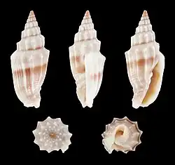 The shell is white, more or less distinctly banded with ash, with a superior, and sometimes one or two inferior narrow chestnut revolving lines. The shell is smooth between the longitudinal ribs.[3]