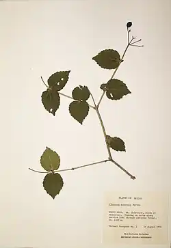 Branches angled, dull, glabrous, pale; branchlets similar, sparsely glandular; leaves opposite, petiolate, the petiole up to 1 cm (0.39 in) long, glandular, hispidulous, stipulate, the stipules persistent, borne on the petiole about 1.5–2 mm (0.059–0.079 in) above its base, linear, up to 5 mm (0.20 in) long, glandular and hispidulous; blades broadly ovate to suborbicular, the larger 6 cm (2.4 in) long by 4.5 cm (1.8 in) wide, cordate or subcordate at base, abruptly short-acuminate at apex, conspicuously dentate (the teeth broad, extending to the middle of the blade or below), ciliate, above sparsely but uniformly strigose (the hairs all simple), glabrate with age, beneath glandular, hispidulous on the veins and veinlets, densely bearded in the vein axils; lateral veins 2 to 5, straight, reaching the margin; peduncle up to 3.5 cm (1.4 in) long, conspicuously glandular, bearing a few stellate hairs, these with numerous spreading branches; bracts at base of inflorescence conspicuous, up to 1.5 cm (0.59 in) long, 2 mm (0.079 in) broad at middle, narrowed at base, glandular and sparsely pubescent, the hairs both simple and stellate; cyme up to 5.7 cm (2.2 in) wide and 3 cm (1.2 in) long, twice compound, the primary rays 6 to 8, very densely glandular; bractlets of cyme linear, glandular, sparingly ciliate; calyx tube 2–2.5 mm (0.079–0.098 in) long, cylindric, densely glandular; calyx lobes about 1 mm (0.039 in) long, acute, ciliate with long simple hairs, glabrous on the back, eglandular; corolla 3.5–4 mm (0.14–0.16 in) long, glabrous; stamens slightly exserted, the filaments about 4 mm (0.16 in) long; style glabrous; fruit much flattened, about 1 cm (0.39 in) long, 8 mm (0.31 in) wide, and 3 mm (0.12 in) thick, fleshy, the endocarp 3-sulcate on one face (the central groove very slight, the lateral pronounced) and lightly 2-sulcate on the other, with no ventral intrusion.[4]