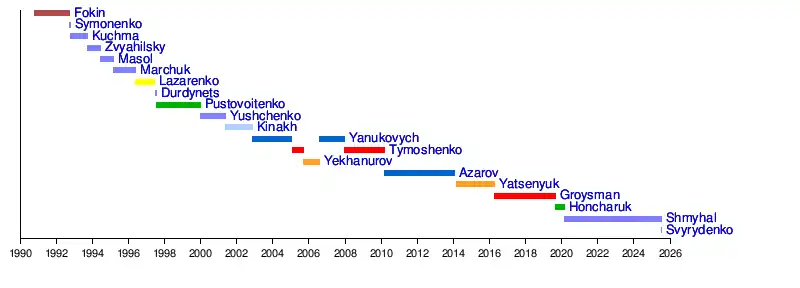 The longest serving prime minister is Shmyhal; followed by Mykola Azarov (two terms) and Yulia Tymoshenko (who also served two terms).[17][18][19][20]