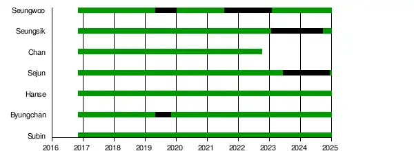 ![]() Victon in January 2021 L to R (Back): Sejun, Seungwoo, Seungsik, Chan (former) (Front): Byungchan, Subin, Hanse | |