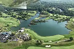An aerial view of Victoria National Golf Club in Newburgh, Indiana. In the foreground is the 18th hole, with the clubhouse visible center-left.