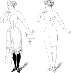 Dress reformers promoted the emancipation waist, or liberty bodice, as a replacement for the corset. The emancipation bodice was a tight sleeveless vest, buttoning up the front, with rows of buttons along the bottom to which could be attached petticoats and a skirt. The entire torso would support the weight of the petticoats and skirt, not just the waist (since the undesirability of hanging the entire weight of full skirts and petticoats from a constricted waist—rather than hanging the garments from the shoulders—was another point often discussed by dress reformers).[12] The bodices had to be fitted by a dressmaker; patterns could be ordered through the mail. Physician Alice Bunker Stockham railed against the corset and said of the pregnancy corset, "The Best pregnancy corset is no corset at all."[6] The "emancipation union under flannel" was first sold in America in 1868. It combined a waist (shirt) and drawers (leggings) in the form we now know as the union suit. While first designed for women, the union suit was also adopted by men, and is still sold and worn today, by both men and women, as winter underclothing.