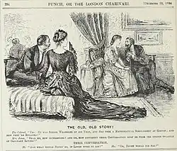 The long 1854 poem The Angel in the House by Coventry Patmore (1823–1896) exemplified the idealized Victorian woman who is angelically pure and devoted to her family and home. The poem was not a pure invention but reflected the emerging legal economic social, cultural, religious and moral values of the Victorian middle-class. Legally women had limited rights to their bodies, the family property, or their children. The recognized identities were those of daughter, wife, mother, and widow. Rapid growth and prosperity meant that fewer women had to find paid employment, and even when the husband owned a shop or small business, the wife's participation was less necessary. Meanwhile, the home sphere grew dramatically in size; women spent the money and decided on the furniture, clothing, food, schooling, and outward appearance the family would make. Patmore's model was widely copied – by Charles Dickens, for example.[77] Literary critics of the time suggested that superior feminine qualities of delicacy, sensitivity, sympathy, and sharp observation gave women novelists a superior insight into stories about home family and love. This made their work highly attractive to the middle-class women who bought the novels and the serialized versions that appeared in many magazines. However, a few early feminists called for aspirations beyond the home. By the end of the century, the "New Woman" was riding a bicycle, wearing bloomers, signing petitions, supporting worldwide mission activities, and talking about the vote.[78]