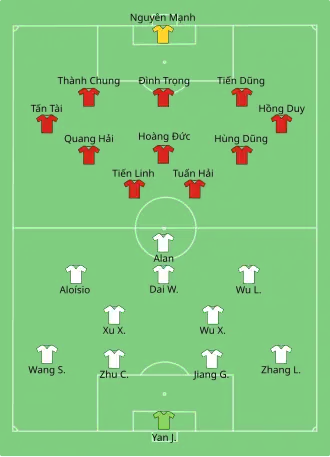 In the second half, China continued to put pressure on Vietnam's field. In the 49th minute, Zhang Yuning put the ball into the opponent's net, but the goal was not recognized because the referee determined it was offside. Although controlling the ball slightly at some points, the away team still did not create many truly dangerous situations. Meanwhile, the Vietnamese team maintained a disciplined playing style and took advantage of opportunities effectively. In the 76th minute, substitute Phan Văn Đức scored the third goal for the home team with a decisive long-range shot from outside the penalty area, raising the score to 3–0. It was not until the last minute of injury time that China was able to score a goal to reduce the score thanks to Xu Xin. However, this goal was only an honorary goal and could not change the outcome of the match.