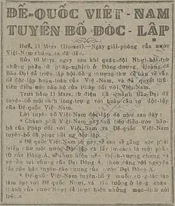 The Empire of Vietnam (Vietnamese: Đế quốc Việt Nam; Literary Chinese and Contemporary Japanese: 越南帝國[a]; Modern Japanese: ベトナム帝国, Betonamu Teikoku) was a short-lived puppet state of Imperial Japan[1] between March 11 and August 25, 1945. It was a member of the Greater East Asia Co-Prosperity Sphere. It was ruled by the Nguyễn dynasty and created when Emperor Bảo Đại declared independence for Vietnam (Tonkin and Annam) from French protection. At the end of its existence, on 14 August 1945, the empire also successfully reclaimed Cochinchina as part of Vietnam.[2]