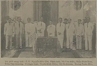 Even though Bảo Đại's messengers were cut off, non-communist leaders in northern and southern Vietnam attempted to challenge the Viet Minh. In Bắc Bộ, Nguyễn Xuân Chữ obtained Kim's approval to form the Committee for National Salvation, and he was appointed by Kim as chairman of the Political Directorate of Bắc Bộ. In Nam Bộ, on August 17, it was announced that all non-Viet Minh factions, including Trotskyists and the southern religious sects of Cao Đài and Hòa Hảo, had joined forces to create the Mặt trận Quốc gia Thống nhất (National Unified Front).[7] Trần Quang Vinh, the Cao Đài leader, and Huỳnh Phú Sổ, the founder of the Hòa Hảo, also issued a communique proclaiming an alliance. On August 19 in Saigon, the Vanguard Youth organised their second official oath-taking ceremony, vowing to defend Vietnamese independence at all costs. The next day, Hồ Vân Nga assumed the interim office of Imperial Commissioner and appointed Kha Vạn Cân, the Vanguard Youth leader, commander of Saigon and Chợ Lớn. Nguyễn Văn Sâm's arrival in Saigon on August 22 provided the National Unified Front with the official declaration of national independence and territorial reunification.[8]