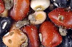 Seeds and seed pods from wild cowpeas are very small,[22] while cultivated varieties can have pods between 10 and 110 cm (4 and 43 in) long.[24] A pod can contain six to 13 seeds that are usually kidney-shaped, although the seeds become more spherical the more restricted they are within the pod.[20][22] Their texture and colour are very diverse. They can have a smooth or rough coat and be speckled, mottled, or blotchy. Colours include white, cream, green, red, brown, and black, or various combinations.[22]