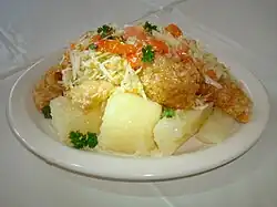 Vigorón is a traditional Nicaraguan dish. It consists of a cabbage salad (chopped cabbage, tomatoes, onions, and chili pepper marinated in vinegar and salt), boiled yuca, and chicharrones (fried pork belly or fried pork rinds), over a banana leaf.[1] This dish is often eaten without utensils, and it is frequently served to visiting family and guests, as it is generally easily and quickly prepared.