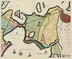 Until the reclamation of the Haarlemmermeer, Vijfhuizen held out against the "Waterwolf" (nickname of the Haarlemmermeer). The village was cut in two by the ring canal and Vijfhuizen came to lie as a piece of old land within the new polder. The street Kromme Spieringweg runs over the dike that has protected Vijfhuizen until the reclamation on the south side. After the reclamation, the first church service in the polder was on January 22, 1853 in an emergency church near Vijfhuizen.