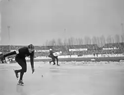 ![]() Viktor Kosichkin in black suit and white armband at 1966 European Allround. | |||||||||||||||