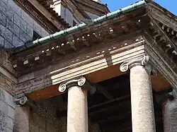 Foscari's façade is in usual style of Palladio, and contains three stories with heavy symmetry. It also features many Roman elements such as a portico, large columns, a triangular pediment, and an emphasis on verticality.[2] The façade is largely thought to by inspired by a temple on the Clitumno river. [5] Strong, bright windows seem to pierce through the stone walls. These thermal windows inspired the ones used on the façade of Villa Toeplitz, another famous Italian home.