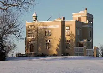 The unique home, sometimes branded as a castle, was built in 1900 by architect George Behrensmeyer for wealthy Quincy native W. George Metz.[1] Metz had a fondness for Mediterranean architecture, and used the Villa Kathrine as his home when he was not venturing the world. Metz eventually sold the castle in 1912, and the site fell into disrepair and neglect before the non-profit Friends of the Castle sought to restore the Villa in 1978.[1] Work on restoring the castle was completed in 1998, and appropriate site furnishings have been donated and obtained by staff throughout the years to further enhance the castle's Moroccan roots. Currently, the site functions as the official tourist information center to the City of Quincy and tours are granted of the site on an appointment basis.
