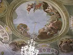 In a room in the eastern part of the villa, in 1708 the Parisian Ludovico Dorigny frescoed a domed ceiling with the Triumph of Spring and four smaller surrounding ovals with the allegories of Love, Glory, Wealth, Abundantia. His painting, in cool and dazzling colours highlights elegant figures on a background of clear skies, with (cherubs and nymphs on clouds going beyond the frame), and follows the conventions of the time. On the walls, in monochrome on a golden background, there are scenes with Apollo and Mars, Venus and Bacchus, the Judgement of Paris, and Pan and Syrinx between various allegorical figures. The paintings show the chiaroscuro of French taste, and inspired the young Tiepolo, who was called to work at the Archbishopric of Udine in 1726–1730.
