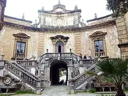 The Villa Palagonia is a patrician villa in Bagheria, 15 km from Palermo, in Sicily, southern Italy. The villa itself, built from 1715 by the architect Tommaso Napoli with the help of Agatino Daidone, is one of the earliest examples of Sicilian Baroque. However, its popularity comes mainly from the statues of monsters with human faces that decorate its garden and its wall, and earned it the nickname of "The Villa of Monsters" (Villa dei Mostri).