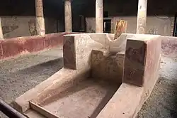 The villa was extended to the east in the age of Claudius (r.41–54 AD) with the addition of a large swimming pool (piscina)[8] bordered on the south and east by trees, with triclinia and peristyles with colonnaded porticoes framing formal gardens and various guest reception and service rooms. Smaller winter gardens were decorated with remarkable frescoes. The baths near the atrium were also remodeled into a group of entertainment rooms in the Fourth-Style.
