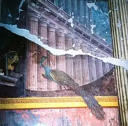 Immediately to the west of the triclinium is a large oecus, which was the main living room of a Roman house. Like the caldarium frescoes, the room is also painted in the Second Style. The east wall includes some wonderful details such as a theatre mask and peacock.[13]