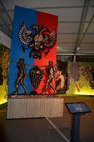 Statues of the messengers, symbols of Poysdorf. Interactive coat of arms in the Hall of Grapes. | |