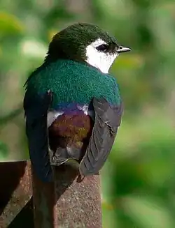 The violet-green swallow (Tachycineta thalassina) is a small North American passerine bird in the swallow family. These aerial insectivores are distributed along the west coast from Alaska to Mexico, extending as far east as Montana and Texas. With an appearance very similar to the tree swallow, these individuals can be identified by the white rump side-patches that appear to separate their green back and purple tail. Violet-green swallows are secondary cavity nesters, found in a number of habitats including deciduous and coniferous forest. In addition to nesting in tree holes within these habitats, they are also widely observed nesting in the cracks of large cliffs.[2]