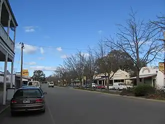 Cowslip Street is the main commercial street of Violet Town. It developed after the railway arrived. However, many of the early buildings were made of timber and burnt down. There are two strips of shops surviving from the end of the 19th century, plus some single buildings worth visiting.[4]