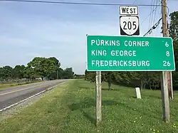 State Route 205 (SR 205) is a primary state highway in the U.S. state of Virginia. The state highway runs 18.47 miles (29.72 km) from SR 3 at Purkins Corner east to SR 3 at Oak Grove. SR 205 connects several small communities in eastern King George County and northwestern Westmoreland County. The state highway also passes through the Potomac River resort of Colonial Beach, where the highway has a spur, State Route 205Y (SR 205Y).