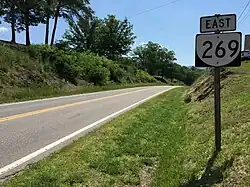 SR 269 begins at a diamond interchange with I-64/US 60. The roadway continues north as SR 42 (Forty Two Road) through Nicelytown. SR 42 runs concurrently with SR 269 south to the former highway's southern terminus at SR 632 (Longdale Furnace Road), where SR 269 turns East on a two-lane undivided road. The state highway parallels I-64/US 60 southeast through the narrow valley of Sharvers Run to the Cowpasture River, then crosses the river and veers northeast to follow Simpson Creek. SR 269 follows the creek to the hamlet of Longdale Furnace to its eastern terminus at a diamond interchange with I-64/US 60. The roadway continues northeast beyond the interchange as SR 850 (North Mountain Road).[1][2]
