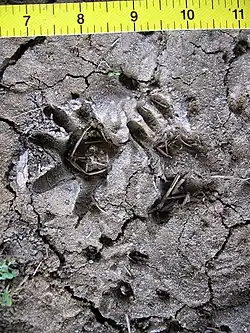 Virginia opossum tracks generally show five finger-like toes in both the fore and hind prints.[22] The hind tracks are unusual and distinctive due to the opossum's opposable thumb, which generally prints at an angle of 90° or greater to the other fingers (sometimes near 180°). Individual adult tracks generally measure 1.9 in long by 2.0 in wide (4.8 × 5.1 cm) for the fore prints and 2.5 in long by 2.3 in wide (6.4 × 5.7 cm) for the hind prints. Opossums have claws on all fingers fore and hind except on the two thumbs (in the photograph, claw marks show as small holes just beyond the tip of each finger); these generally show in the tracks. In a soft medium, such as the mud in this photograph, the foot pads clearly show (these are the deep, darker areas where the fingers and toes meet the rest of the hand or foot, which have been filled with plant debris by wind due to the advanced age of the tracks).