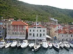 The town of Vis is in a relatively large and protected bay (Croatian: Uvala Svetog Jurja,[5] English: Bay of Saint George) on the island's northeast side, facing the island of Hvar and the Dalmatian mainland. The port of Vis is in the southwest part of the bay. The port is protected from the open sea's influence by the islet Host (named after William Hoste) and the peninsula Prirovo (sometimes spelled "Prilovo"). Other, smaller ports are in Kut[6] and Stonca, which are also parts of the town of Vis.
