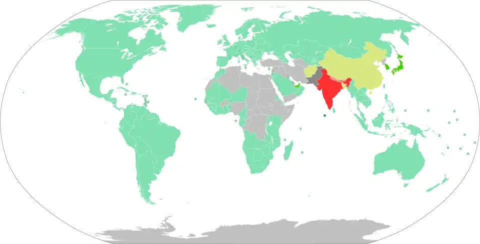 Under reciprocal agreements, holders of diplomatic or various types of passports (consular, official, service and special) of the following countries and territories may enter and remain in India without a visa for the following period:[3]