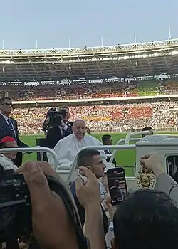 Indonesian President Joko Widodo met with Pope Francis shortly before Pope Francis met the congregation.[88] Joko Widodo was accompanied by a number of officials, including Coordinating Minister Luhut Binsar Panjaitan, National Police Chief Listyo Sigit Prabowo, and TNI Commander Agus Subiyanto.[89] Pope Francis then travelled around to meet the congregation at the Madya Stadium, before later greeting the congregation at the Gelora Bung Karno Main Stadium. While travelling around, Pope Francis used a Maung car made by Pindad, which was named Maung MV3 Popemobile.[90] While the Pope was travelling around, the congregation chanted Viva Il Papa and Viva Papa Francesco, as well as the song Kristus Jaya[91] (Victorious of Christ) and the song Ave-Ave (Di Lourdes di Gua) (Ave-Ave (In The Cave of Lourdes)).[92] Before the mass, the congregation prepared themselves through a silentium which created silence at the mass location.[93]