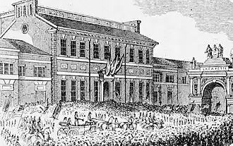 The Bourbon constitutional monarchy had been restored in France for at least ten years, but King Louis XVIII was reliant on a wheelchair in the spring of 1824 and suffering from severe health issues that proved fatal by late summer.[2] Further, Lafayette was being monitored by the dying king.[3] Lafayette left the French legislature in 1824, and President James Monroe invited him to tour the United States, partly to instill the "spirit of 1776" in the next generation of Americans[4] and partly to celebrate the nation's 50th anniversary.[5]