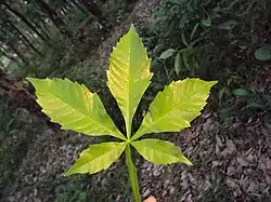 Vitex altissima, the peacock chaste tree, is a species of woody plant reaching some 20 m in height, in the family of Lamiaceae. It is native to the Indomalayan realm, namely Bangladesh, India, Indonesia, Myanmar, and Sri Lanka, and is also found in New Guinea.[2] Its greyish bark becomes scaly with maturity. The leaves are trifoliolate or palmate, compound and opposite. They are elliptic or elliptic-lanceolate in shape with acuminate apex and cuneate base. The margin is serrate or sometimes entire. The inflorescences are in terminal panicles. The corolla is bluish white. The purplish black fruit is a four-seeded drupe.[3]