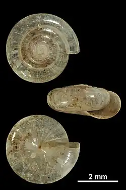 The shell is small: 1.3-2.2 mm x 2.5–5 mm (diameter 2.6-2.7 mm at 3 whorls, 3.5-3.8 mm at 4 whorls)