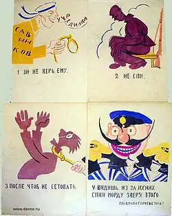 From 1919 to 1921, Mayakovsky worked for the Russian Telegraph Agency (ROSTA). Painting posters and cartoons, he provided them with rhymes and slogans (mixing rhythm patterns, different typesetting styles, and using neologisms) which were describing the currents events in dynamics.[8][14] In three years he produced some 1100 pieces he called "ROSTA Windows".[15]