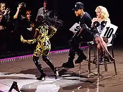 Three years later, Madonna included "Vogue" on The Girlie Show tour, where it was given a Thai-themed performance.[140] She wore an ensemble consisting of black sequined hot pants and a bra paired with knee-high military boots and a large beaded headdress that was described by her tour director and brother Christopher Ciccone as "part Erté, part Zizi Jeanmaire".[141] Santiago Fouz-Hernández and Freya Jarman-Ivens criticized the singer for placing "her signature over-exaggeration and deformation in an Asian worldview and Hinduism".[140] The performance on the November 19, 1993, show at Sydney Cricket Ground was recorded and included on the video release The Girlie Show: Live Down Under.[142] In 2004, Madonna opened the Re-Invention tour with a performance of the song in a Marie Antoinette-themed setting.[143] She arrived on stage atop a rising platform dressed in a jewel encrusted corset.[144][145] Madonna struck yoga poses and at one point, supported herself on her forearms.[144] Sal Cinquemani from Slant Magazine commented that the performance gave new meaning to the slogan "strike a pose".[146] The number was included in the I'm Going to Tell You a Secret live album and documentary.[147] A mashup of "Vogue", Madonna's own "4 Minutes", and Timbaland's "Give It to Me", was performed on the Sticky & Sweet tour in 2008 and 2009.[28][148] Madonna was dressed in a black leotard and fishnet tights while the dancers wore bondage-inspired gear; together they did a synchronized choreography to the song.[149][150] It received generally mixed reviews from critics.[28][151] The performance was included on the Sticky & Sweet Tour live CD and DVD release, recorded in Buenos Aires, Argentina.[152]