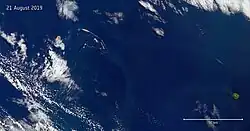 In August 2019 a 150 km2 (58 sq mi) pumice raft was discovered floating in the Pacific Ocean in Tonga.[4][5] The pumice raft was observed by numerous yachts and reached Fiji in September.[6] Discoloured water and analysis of the drift path using satellite imagery showed that the raft had originated from an eruption of Volcano F beginning on 6 August 2019.[2][7][8] The eruption was preceded by a series of earthquakes on 5 August, and ceased on 8 August.[2]