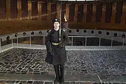 The Volgograd Honour Guard (Russian: Рота Почетный караул Волгоград), officially known as the Honour Guard Company of the 20th Separate Guards Motor Rifle Brigade is a ceremonial unit of the Russian Armed Forces that is subordinate to the 20th Guards Motor Rifle Brigade of the Southern Military District. Its main task is to guard the Mamayev Kurgan Memorial Complex from 9 AM to 8 PM[2] and to participate in the escorting of special guests to Volgograd.[3][4] In addition, the personnel of the company take part in commemorations and events held in the Southern Military District. All 100 members of the company have to be at least 180 cm (5 ft 11 in).[5][6][7] The company uses uniforms from the 154th Preobrazhensky Independent Commandant's Regiment, though not directly associated with it.