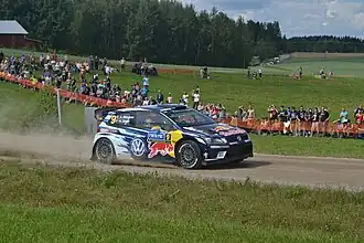 In its debut season, the car scored six wins in its first eight rallies. After finishing second on the Rallye Monte Carlo,[21] Sébastien Ogier went on to win the rallies of Sweden,[22] Mexico,[23] and Portugal.[24] Jari-Matti Latvala scored his first win for Volkswagen in Greece.[25] Following concerns that the cost of moving to a new specification for the 2014 season would drive Ford and Citroën out of the category, Volkswagen successfully lobbied to keep the current car spec for another year.[26] Ogier continued his winning streak with victories in the Rally d'Italia Sardegna,[27] Rally Finland,[28] and had the opportunity to secure the FIA World Rally Championship for Drivers at the Rally Deutschland. However, a mistake on the first leg forced him into retirement, and while he re-entered the following day under the Rally-2 regulations, doing so came with an automatic five-minute time penalty and Ogier finished seventeenth overall.[29] Despite this, Ogier won the rally's power stage, and as a result, would go on to score points in every round of the championship.[30]