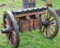 In the mid-1570s a volley gun which was capable of holding from 160 to 320 shots and firing them 4, 8, 12 or 24 bullets at a time, referred to as an 'ingen of war', was presented to the government of England.[2][3] Multi-barreled artillery pieces continued in use during the 16th and 17th century. A double-barreled cannon called Elizabeth-Henry, named after Charles I's youngest children,[4] was used by the Cavaliers during the English Civil War and fired 2oz charges or grapeshot. The barrels were wrapped in leather to prevent rusting.