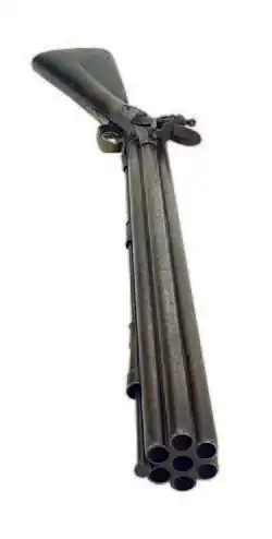 The Nock gun resembled a conventional flintlock musket with seven barrels hexagonally brazed around a central barrel. All seven .46 caliber (12 mm) barrels were connected to the single flintlock pan in a manner intended to produce simultaneous discharge through row ignition, but one or more barrels frequently failed to fire. The gun was invented by James Wilson in 1779[6] and manufactured by Henry Nock for use through the Napoleonic Wars. Five hundred Nock guns were produced for the Royal Navy intended for use in repelling boarders or to clear an enemy deck in advance of friendly boarding parties. Admiral Howe's fleet was issued twenty guns for each ship of the line and twelve guns for each frigate. Recoil of the 13-pound (5.9 kg) Nock gun caused dislocated shoulders and clavicle fractures among the sailors firing Nock guns; and the muzzle flash from simultaneous discharge of multiple barrels could ignite canvas sail when fired from positions in the rigging.[1] The Nock volley gun was considered obsolete by 1805, but a surviving weapon was carried by Richard Widmark in the 1960 movie The Alamo. The Nock gun was recently brought to public attention by its inclusion in Bernard Cornwell's Sharpe novels where it was wielded by both Sharpe and his friend and colleague Sergeant Patrick Harper.[1]